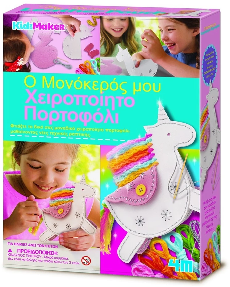 Επιτραπέζιο 4M Κατασκευή Πορτοφόλι Μονόκερος Φτιάξε το δικό σου μοναδικό πορτοφόλι μονόκερου και μάθε νέες τεχνικές ραψίματος. Ύψος πορτοφολιού: 17 εκ. Περιέχει:1 σετ έτοιμων λευκών κομματιών δερματίνης, 1 σετ έτοιμων ροζ κομματιών δερματίνης, 2 πλαστικές βελόνες, 1 καρούλι ασημί κορδόνι, 5 καρούλια χρωματιστού νήματος, 1 κουμπί και λεπτομερείς οδηγίες.
