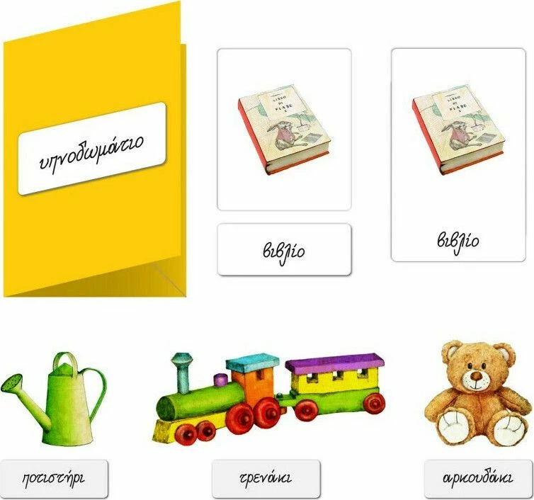 Το παιδί καλείται να ταιριάξει τις κάρτες με τις εικόνες με εκείνες με τις αντίστοιχες λέξεις. Ο στόχος είναι να τονωθεί η ανάπτυξη του λεξιλογίου με φυσικό τρόπο!