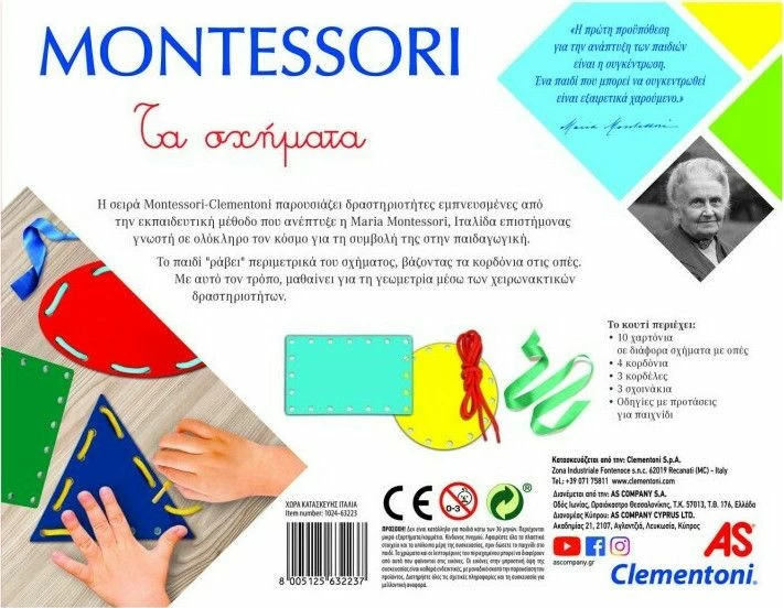 AS Επιτραπέζιο Montessori Τα Σχήματα Μέσα από την άσκηση της επιδεξιότητας το παιδί θα μάθει τη γεωμετρία με έναν εύκολο και φυσικό τρόπο, τοποθετώντας τα χρωματιστά κορδόνια στις μορφές χαρτονιού με μικρές τρύπες στο περίγραμμα.