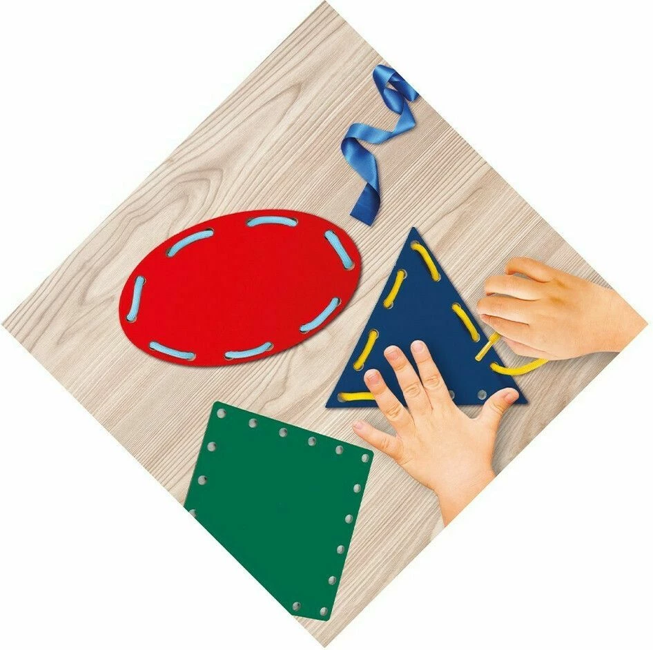 Μέσα από την άσκηση της επιδεξιότητας το παιδί θα μάθει τη γεωμετρία με έναν εύκολο και φυσικό τρόπο, τοποθετώντας τα χρωματιστά κορδόνια στις μορφές χαρτονιού με μικρές τρύπες στο περίγραμμα.