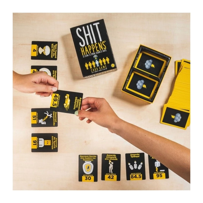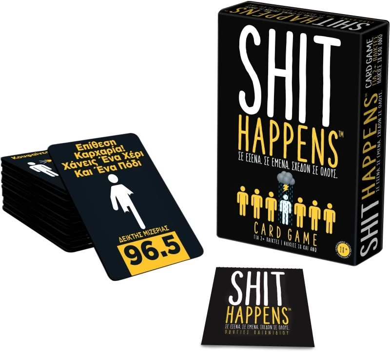 Επιτραπέζιο Shit Happens. Σε όλους μας συμβαίνουν άσχημα γεγονότα…Ταξινόμησέ τα ανάλογα με το πόσο θλιβερά είναι.Κάθε ατυχής κατάσταση βαθμολογείται από το 1 έως το 100, χρησιμοποιώντας τον ΔΕΙΚΤΗ ΜΙΖΕΡΙΑΣ. Οι παίκτες προσπαθούν να ταξινομήσουν αυτές τις καταστάσεις σύμφωνα με αυτό τον δείκτη. Αν έχεις δίκιο, κρατάς την κάρτα!Συγκέντρωσε 10 κάρτες ΣΤΟ ΜΟΝΟΠΑΤΙ ΤΟΥ ΠΟΝΟΥ σου και κέρδισε!Ιδανικό αν θέλετε να κάνετε τους φίλους σας να κλάψουν από τα γέλια!