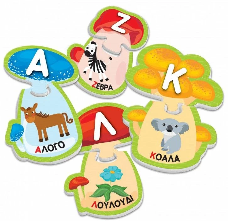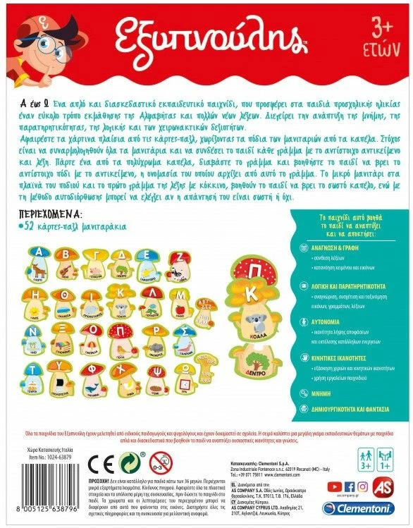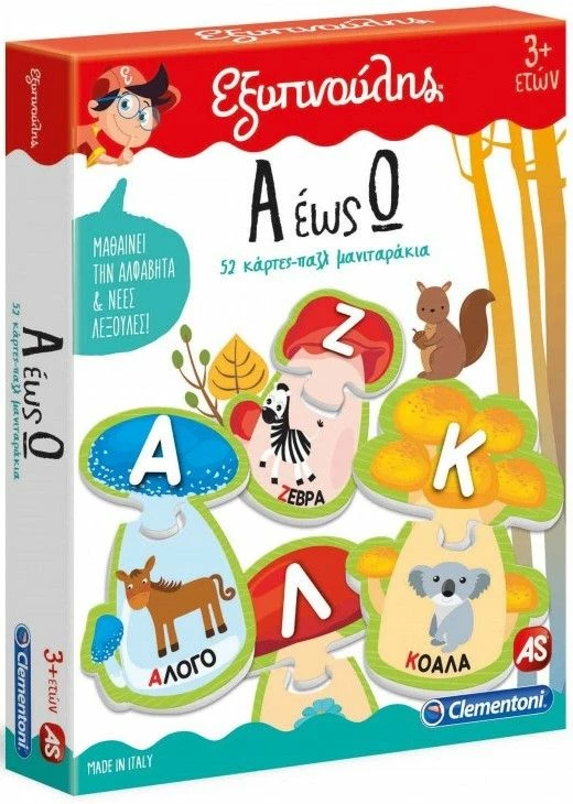 Εξυπνούλης Α-Ω Ένα φανταστικό παιχνίδι για να μάθουν παίζοντας ποια είναι τα γράμματα και να τα συνδέουν με τις αντίστοιχες λέξεις ενώ παρατηρούν τις εικόνες στις κάρτες μανιτάρια. Περιέχονται : 52 κάρτες – παζλ μανιταράκια
