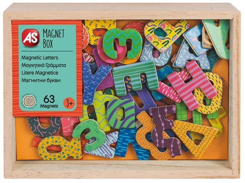 Παιχνίδι με 63 ξύλινους μαγνήτες- γράμματα. Αποτελεί ιδανικό τρόπο για να μάθει το παιδί τη γραφή και τη γλώσσα μέσα από το παιχνίδι. Τα γράμματα παρέχονται σε διαφορετικά χρώματα και σχέδια, ώστε να μπορεί το παιδί να δημιούργήσει άπειρες λέξεις και να εξοικειωθεί μαζί τους με τον πιο διασκεδαστικό τρόπο. Εύκολη τοποθέτηση και επανατοποθέτηση σε οποιαδήποτε μαγνητική επιφάνεια. Ξεκινάμε να μαθαίνουμε τα γράμματα με το Magnet Box.