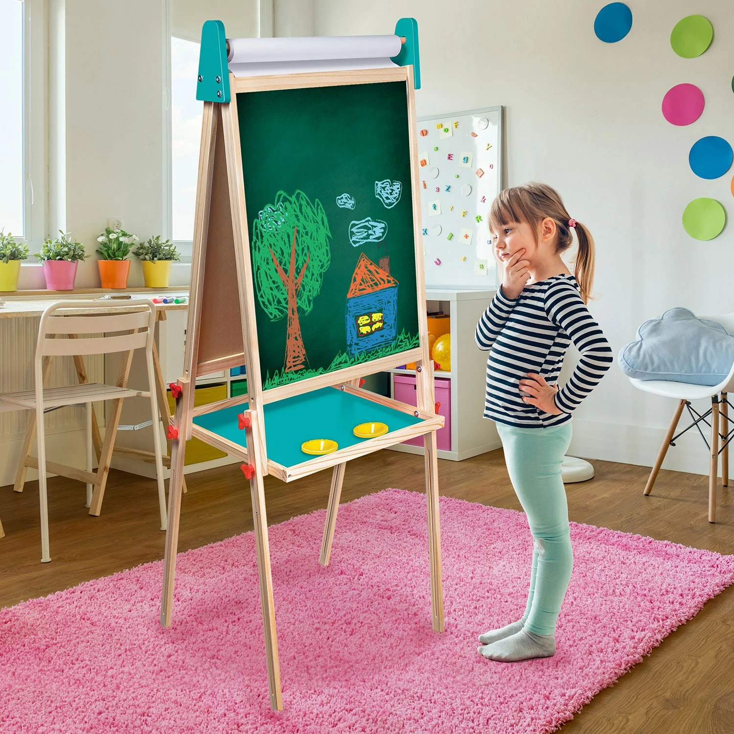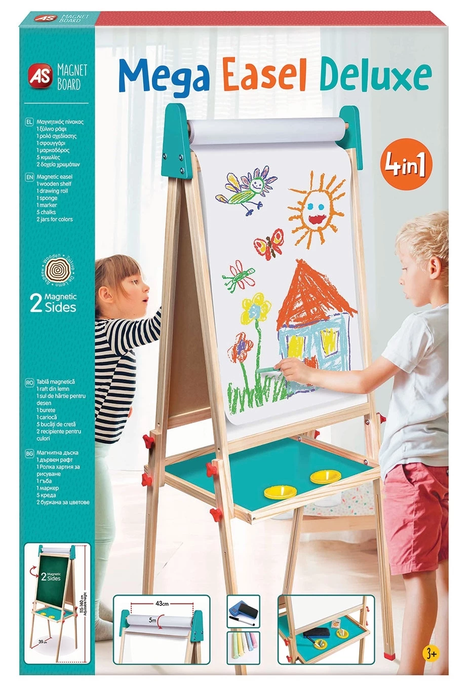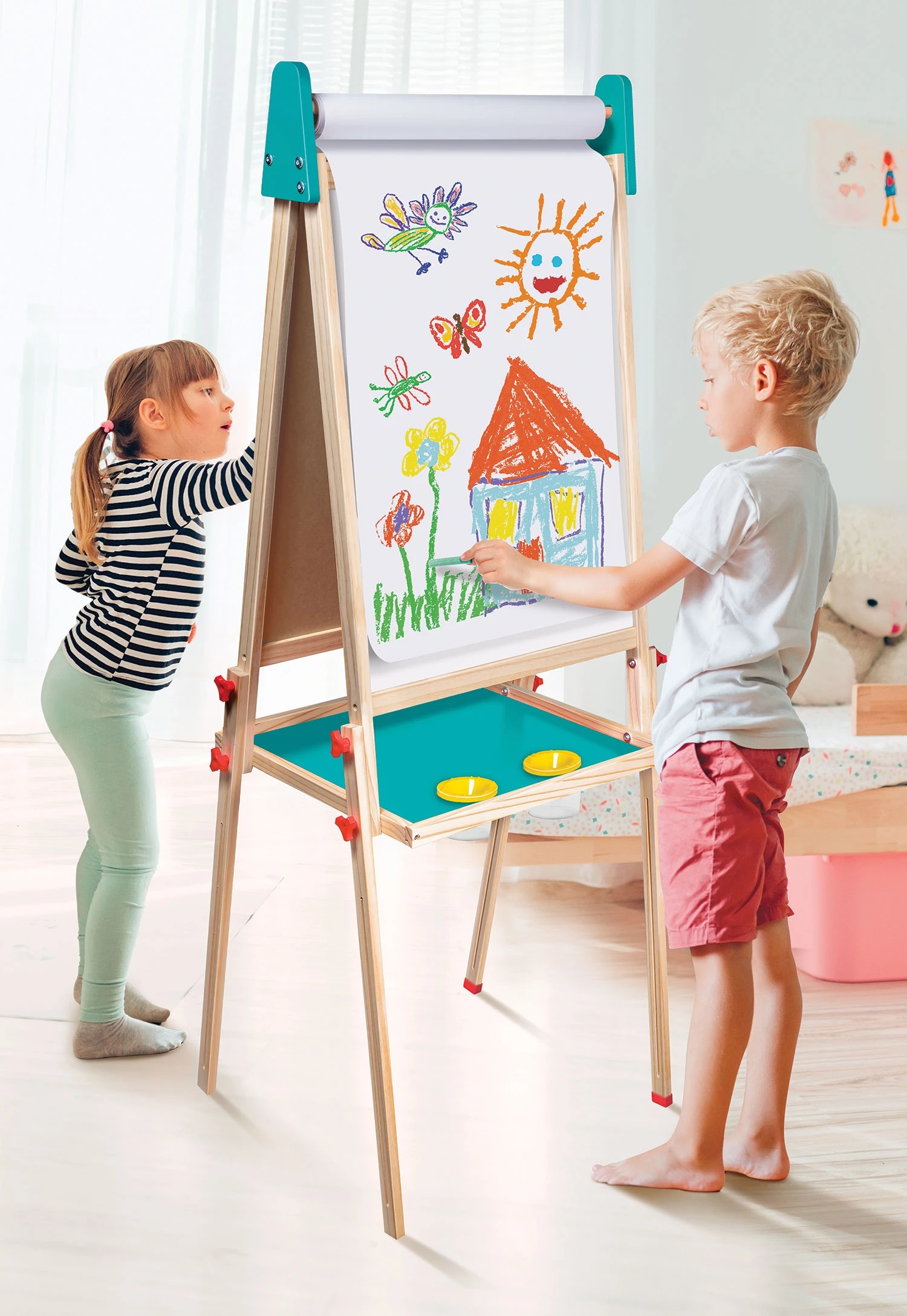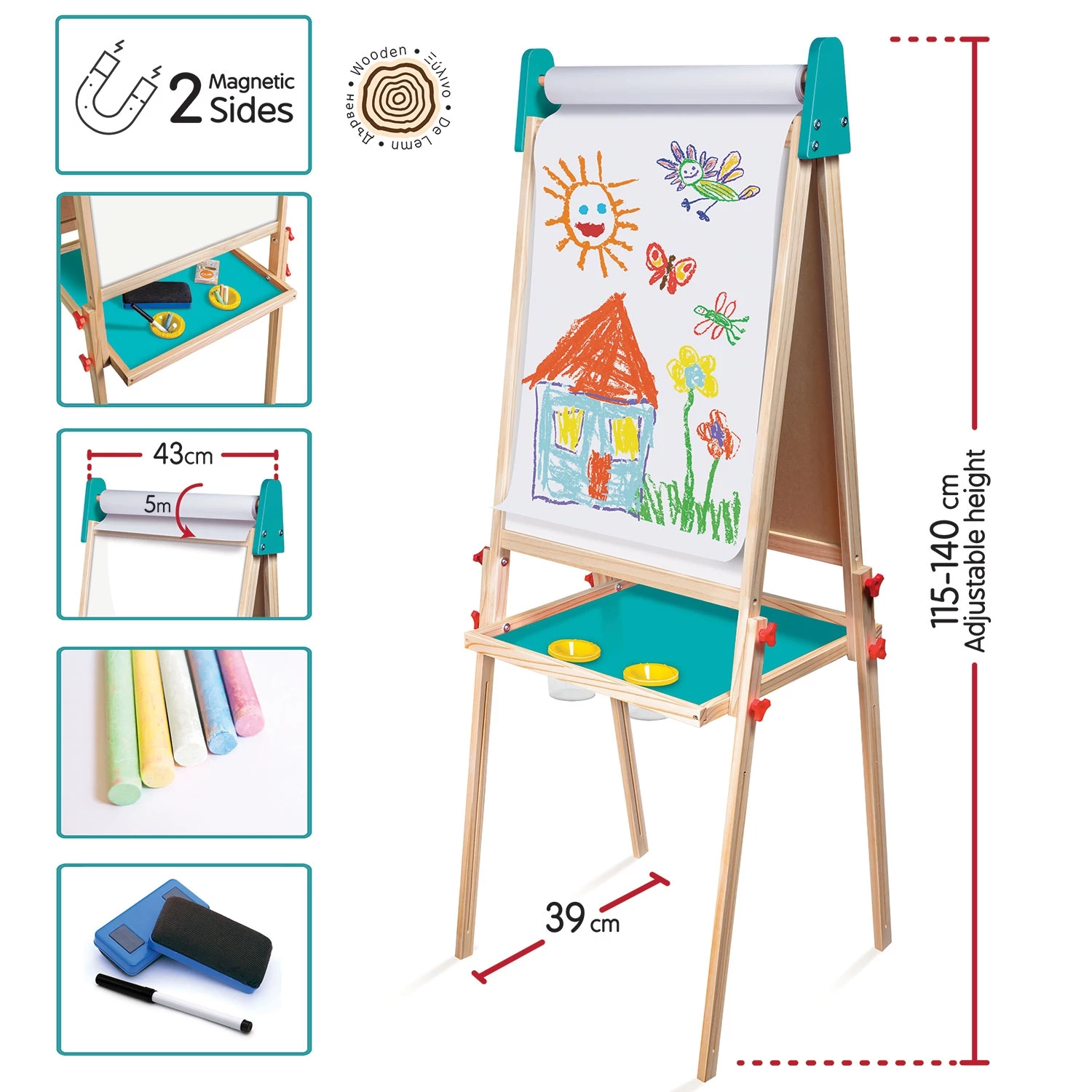 Ξύλινος επιδαπέδιος πίνακας 4 σε 1. Η μία όψη του αποτελεί μαυροπίνακα για κιμωλίες και η άλλη πίνακα μαρκαδόρου. Και οι 2 όψεις είναι μαγνητικές δίνοντας τη δυνατότητα για περισσότερα παιχνίδια με μαγνήτες. Επίσης περιλαμβάνει ρολό χαρτί 5m, 5 κιμωλίες, μαρκαδόρο, σφουγγάρι και 2 κυπελάκια για αποθήκευση/ανάμιξη χρωμάτων. Το ύψος του (115 εκ.-140 εκ.) διαμορφώνεται ανάλογα με τις ανάγκες σας και μεγαλώνει μαζί με το παιδί.