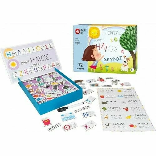 Το AS Magnet Box Μαθαίνω να γράφω είναι ένα εκπαιδευτικό μαγνητικό παιχνίδι που προτρέπει το παιδί να μάθει να γράφει μέσω του παιχνιδιού με μαγνήτες. Το παιδί ξεκινά με την εκμάθηση των γραμμάτων και της γραφής αυτών, στη συνέχεια αντιστοιχεί τους μαγνήτες γραμμάτων με αντίστοιχες εικόνες απλών λέξεων και τέλος εξασκεί τη γραφή των λέξεων στον πίνακα ακολουθώντας την προγραφή που εμφανίζεται στο φυλλάδιο που εσωκλείεται. Ένα παιχνίδι διαβαθμισμένης δυσκολίας, το οποίο χάρη στον ειδικό πίνακα γράψε-σβήσε και στο μαρκαδόρο με σφουγγαράκι που περιέχει, δίνει τη δυνατότητα στο παιδί να επαναλάβει τις ασκήσεις όσες φορές το επιθυμεί, καθώς και να γράψει τις δικές του λέξεις! Περιλαμβάνει 72 χάρτινους μαγνήτες, 1 μαρκαδόρο με σφουγγαράκι, 1 μαγνητικό πινακάκι, και εικονογραφημένο οδηγό για την εκμάθηση των λέξεων και με ασκήσεις προγραφής.Τι είναι τα AS Magnet Box;Η σειρά Magnet Box χρησιμοποιεί ξύλινους και χάρτινους μαγνήτες, εκπαιδεύοντας τα παιδιά να αναπτύξουν τις ικανότητές τους ενώ παράλληλα απελευθερώνει τη φαντασία τους. Μέσα από το παιχνίδι με τα Magnet Box, το παιδί εξασκεί τη λεπτή κινητικότητα και το συντονισμό ματιού-χεριού, καθώς μαθαίνει να συνδυάζει μαγνήτες. Το κυριότερο όμως είναι ότι η σειρά βοηθά στην κοινωνική και συναισθηματική ανάπτυξη του παιδιού, μέσω της συνεργασίας και της καλλιέργειας της ενσυναίσθησής του. Η σειρά έχει λάβει το βραβείο Silver Award στην κατηγορία Καλύτερο Εκπαιδευτικό Παιχνίδι στα Toys Awards 2021.