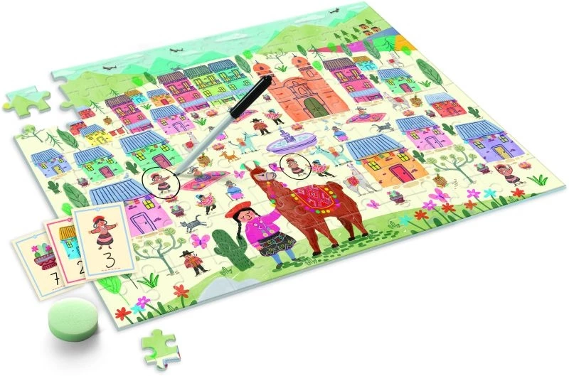 Ένα παζλ γεμάτο λεπτομέρειες, σχεδιασμένο να ενισχύει τη μαθηματική σκέψη, χάρη στα πολλά αντικείμενα που απεικονίζει. Το παιδί πρέπει να αναζητήσει, να μετρήσει και στη συνέχεια να γράψει τον αριθμό που ανιχνεύει.