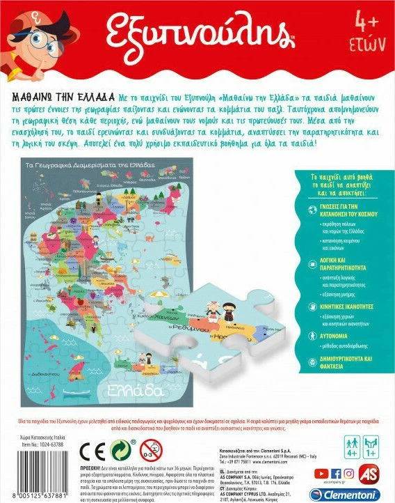 Ο πιο απλός και διασκεδαστικός τρόπος να μάθουν τα παιδιά γεωγραφία! Τα παιδιά μαθαίνουν τις πρώτες έννοιες της γεωγραφίας παίζοντας και ενώνοντας τα κομμάτια του παζλ. Την ίδια στιγμή, απομνημονεύουν τη γεωγραφική θέση της περιοχής. Με το Μαθαίνω την Ελλάδα, το παιδί συνδυάζει την ικανότητα χειρισμού και αυτήν της παρατηρητικότητας και της λογικής.