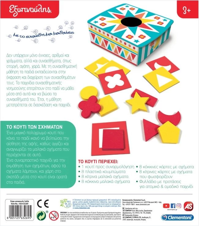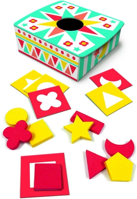 Ένα μεγάλο κουτί περιέχει μια σειρά από σχήματα και ειδικά πλακίδια, για να ανακαλύψει το παιδί και να μαντέψει τα σχήματα που είναι κρυμμένα! Το παιδί, αφού τα έχει αναγνωρίσει με την αίσθηση μέσα στο κουτί, θα πρέπει να τοποθετήσει τα σχήματα στις αντίστοιχες κάρτες.