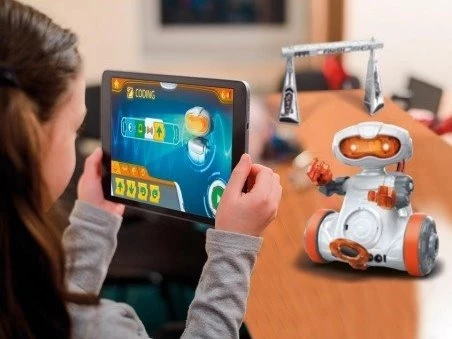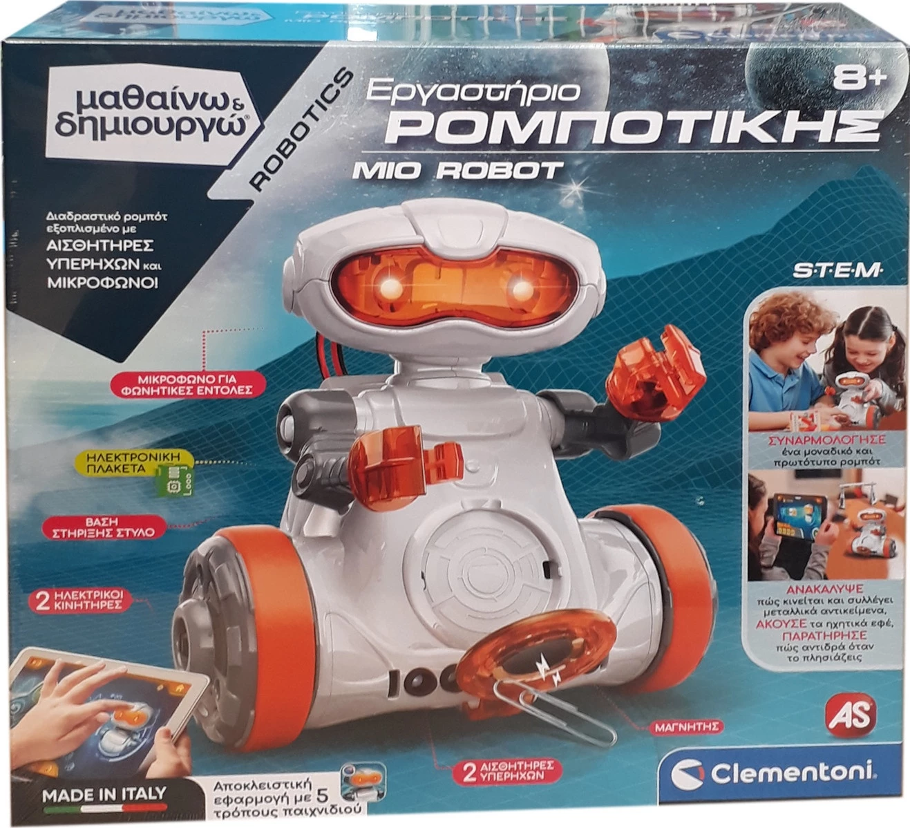 Ένα μοναδικό και πρωτότυπο ρομπότ συναρμολογούμενο, με πολλούς διασκεδαστικούς τρόπους παιχνιδιού! Χάρη σε δύο αισθητήρες υπερύθρων, το νέο Mio Robot μπορεί να αποφύγει εμπόδια και να ακολουθήσει το χέρι σας σαν πραγματικό κυνηγόσκυλο. Μπορείτε να χρησιμοποιήσετε το μικρόφωνο για να το παραγγείλετε χτυπώντας απλά τα χέρια σας, ενώ το κουμπί στην πλάτη του ρομπότ, μπορεί να χρησιμοποιηθεί για τον προγραμματισμό της διαδρομής του. Η δωρεάν εφαρμογή έχει δύο ενότητες παιχνιδιού: κωδικοποίηση, εκμάθηση των αρχών προγραμματισμού που βασίζονται σε μπλοκ και πραγματικό χρόνο, έλεγχος κινήσεων, ήχων και εφέ φωτισμού. Τέλος, με τη θήκη δείκτη και τη θήκη μαγνήτη αντίστοιχα μπορείτε να κάνετε το ρομπότ να σχεδιάσει ή να το προγραμματίστει για αναζήτηση μικρών νομισμάτων και συνδετήρων χαρτιού.
