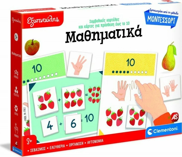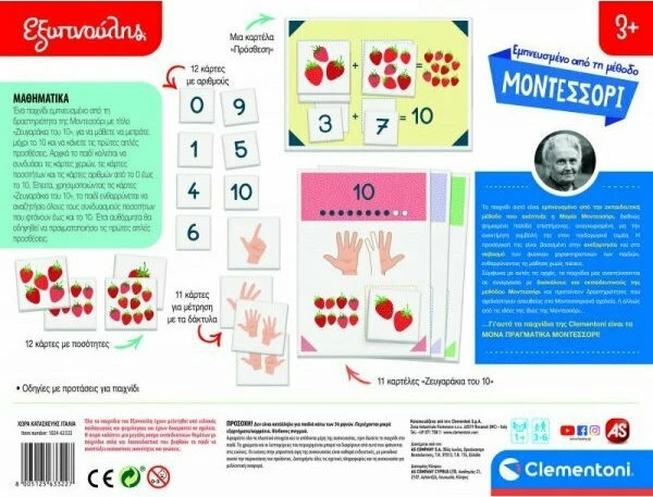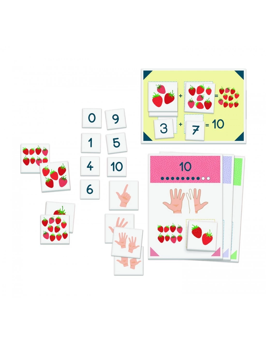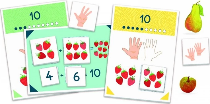 Ένα παιχνίδι εμπνευσμένο από τη δραστηριότητα της Montessori που ονομάζεται «Ζευγαράκια του 10», για να μάθει το παιδί πώς να μετράει μέχρι το 10 και να κάνει τις πρώτες απλές προσθέσεις. Το σετ περιέχει 11 κάρτες για να μετράτε με τα δάχτυλά σας, 11 κάρτες με ποσότητες, 10 κάρτες με αριθμούς, 9 κάρτες «ζευγαριών του 10» και μια καρτέλα για προσθέσεις. Στην αρχή το παιδί καλείται να συνδυάσει τις κάρτες χεριών, τις κάρτες ποσοτήτων και τα αριθμητικά σύμβολα, για να μάθει πώς να μετράει έως το 10. Στη συνέχεια, χάρη στις κάρτες «ζευγαριών του 10», μπορεί να διασκεδάσει ψάχνοντας όλους τους συνδυασμούς ποσοτήτων που έχουν το άθροισμα του 10. Έτσι θα οδηγηθεί αυθόρμητα για να πραγματοποιήσει τις πρώτες του μαθηματικές πράξεις.