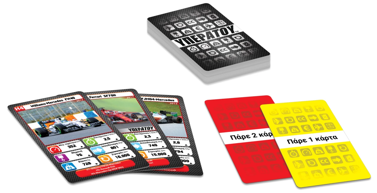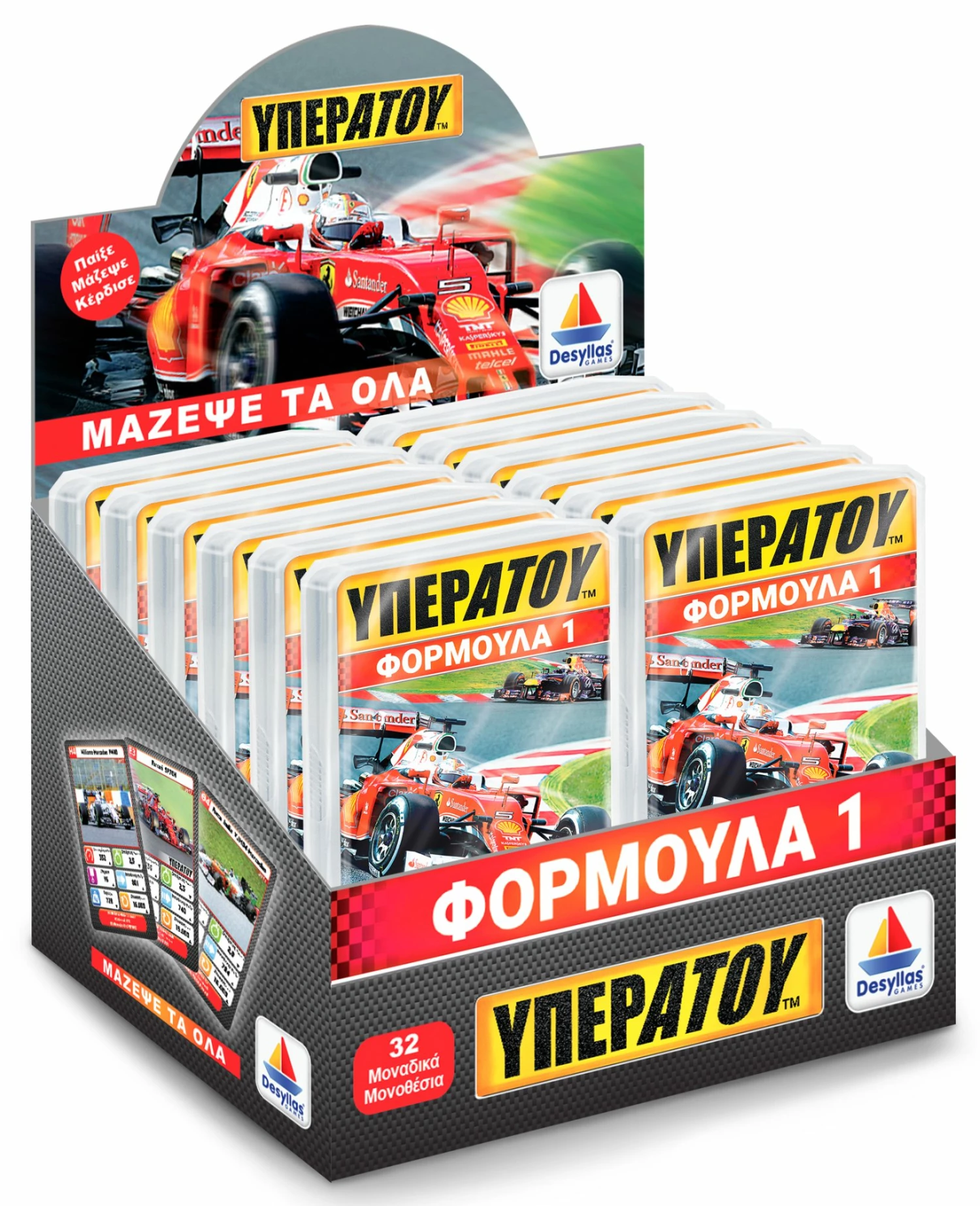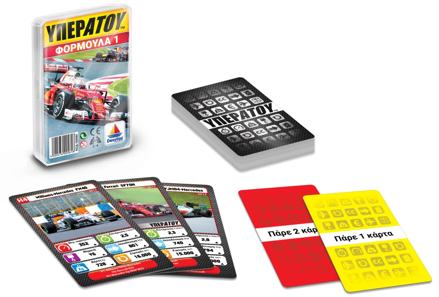 Υπερατού – Φόρμουλα 1 Ετοιμάσου για ένα ταξίδι στο παρελθόν, με τις καινούργιες τράπουλες «ΥΠΕΡΑΤΟΥ». Διάλεξε χαρακτηριστικό, σύγκρινε το με του αντιπάλου, και κέρδισε την κάρτα! Χρησιμοποίησε έξυπνα την κάρτα ΥΠΕΡΑΤΟΥ και βγες μπροστά! Παίξε και μάθε τα πάντα για τα πιο απίστευτα οχήματα του πλανήτη! Περιέχει: 35 κάρτες. •32…