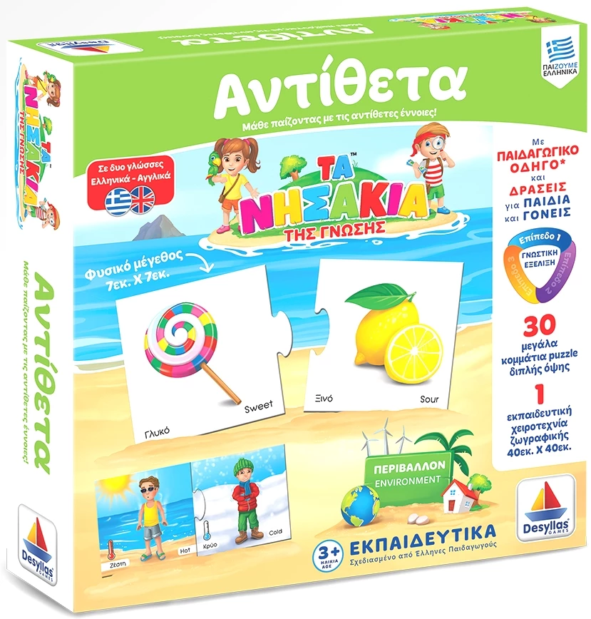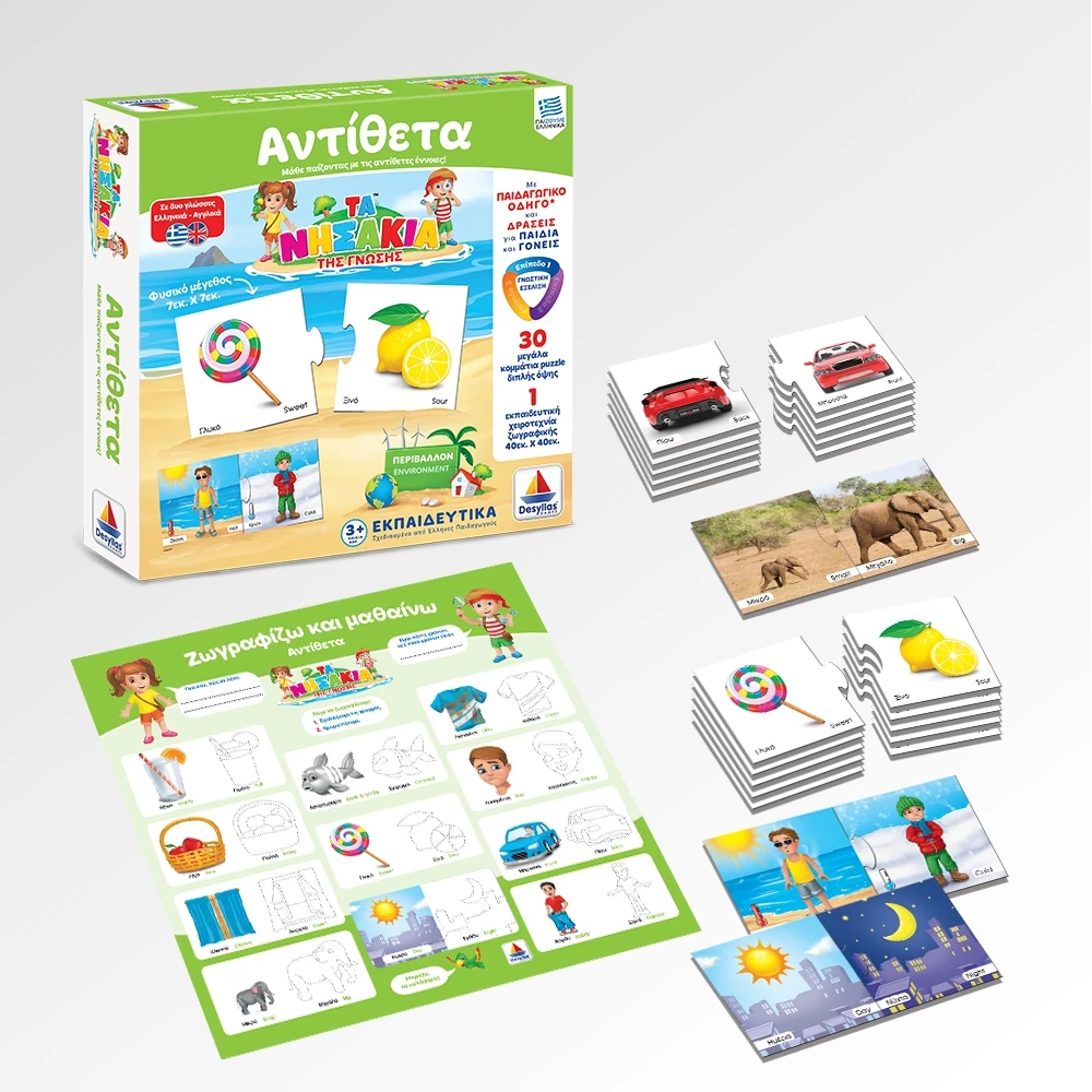 Κλειστό ή ανοιχτό, µεγάλο ή µικρό; Βρες τις αντίθετες έννοιες, ένωσε τα κοµµάτια puzzle µεταξύ τους και µάθε τα αντίθετα στα ελληνικά και στα αγγλικά! Περιέχει και εκπαιδευτική χειροτεχνία, µε την οποία τα παιδιά ζωγραφίζοντας και δηµιουργώντας θα εµπεδώσουν τις αντίθετες έννοιες του παιχνιδιού!