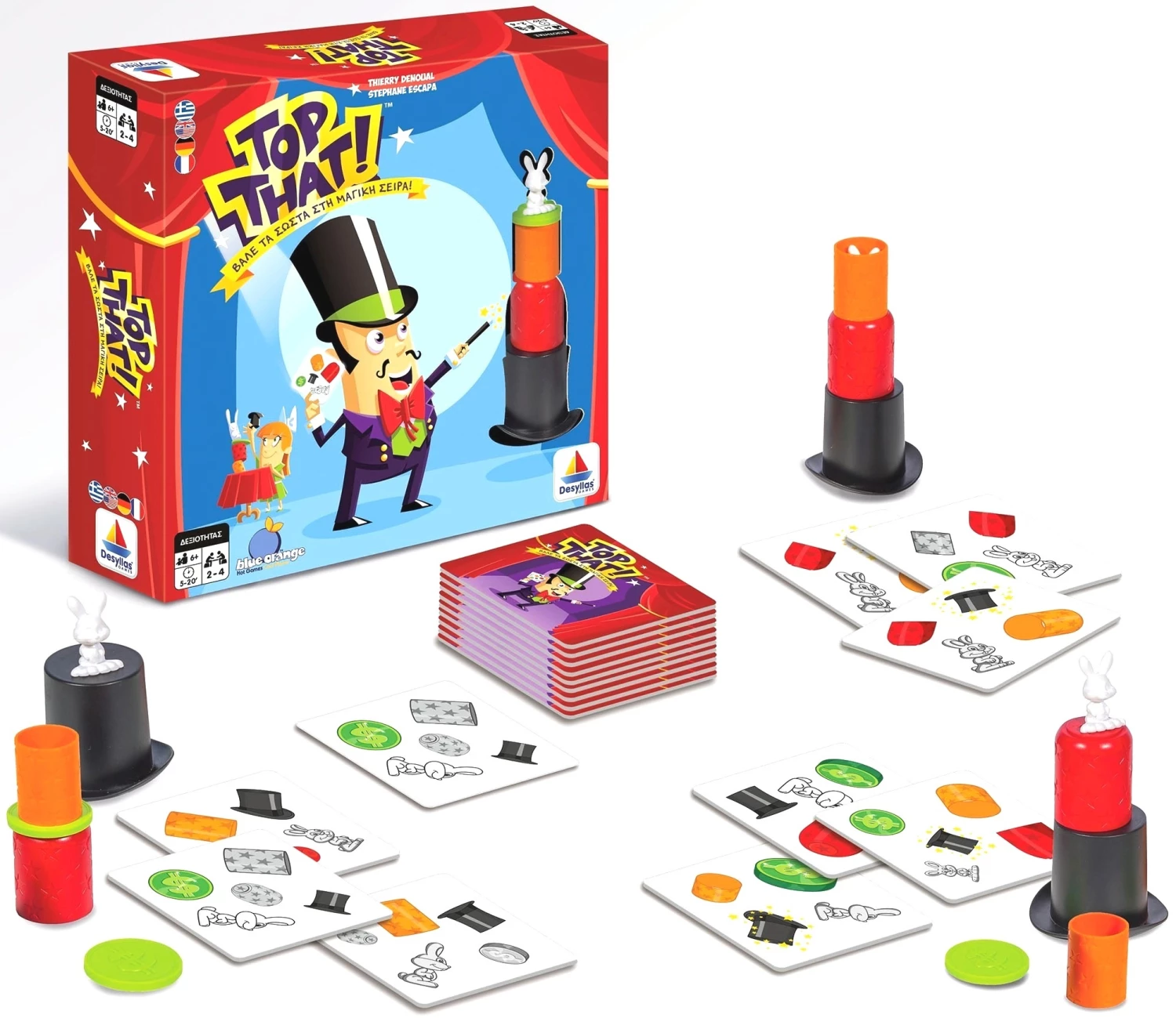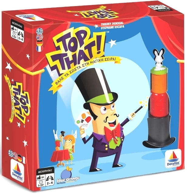 Επιτραπέζιο Δεσύλλας – Top That! Στο TOP THAT! οι παίκτες προσπαθούν να τοποθετήσουν τα μαγικά αντικείμενα τους σε μία στοίβα, πιο γρήγορα από τους άλλους παίκτες. Σε κάθε γύρο, οι παίκτες τραβάνε μία κάρτα πρόκλησης που υποδεικνύει πως θα πρέπει να τοποθετήσουν τα αντικείμενα τους οι παίκτες. Υπάρχουν μόνο 4…