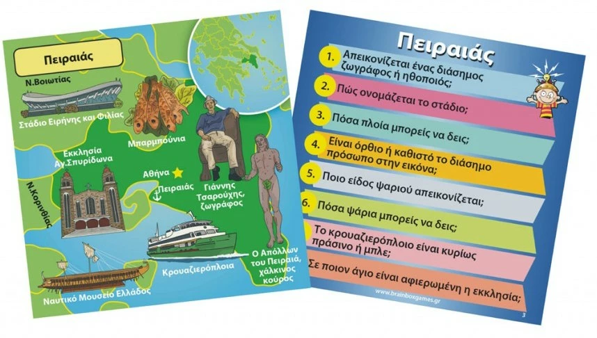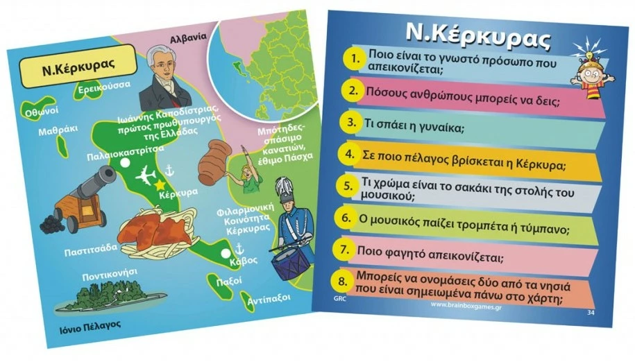 Το BrainBox Ελλάδα έχει σχεδιαστεί για να προσφέρει απίστευτες στιγμές διασκέδασης σε όλη την οικογένεια και στην παρέα. Βοηθάει στη βελτίωση της παρατηρητικότητας και των μνημονικών ικανοτήτων, ενώ παράλληλα εμπλουτίζεις τις γνώσεις σου για τους νομούς, τις μεγαλύτερες πόλεις και τα νησιά της Ελλάδας. Κάθε κάρτα έχει εικόνες με μνημεία, ανθρώπους, φαγητά, ζώα και πολλές ακόμη ενδιαφέρουσες και διασκεδαστικές πληροφορίες! Από τη Θεσσαλονίκη ως την Κρήτη, από την Κέρκυρα ως την Ρόδο και την Κύπρο, αυτό το BrainBox σε ταξιδεύει σε όλη την Ελλάδα!