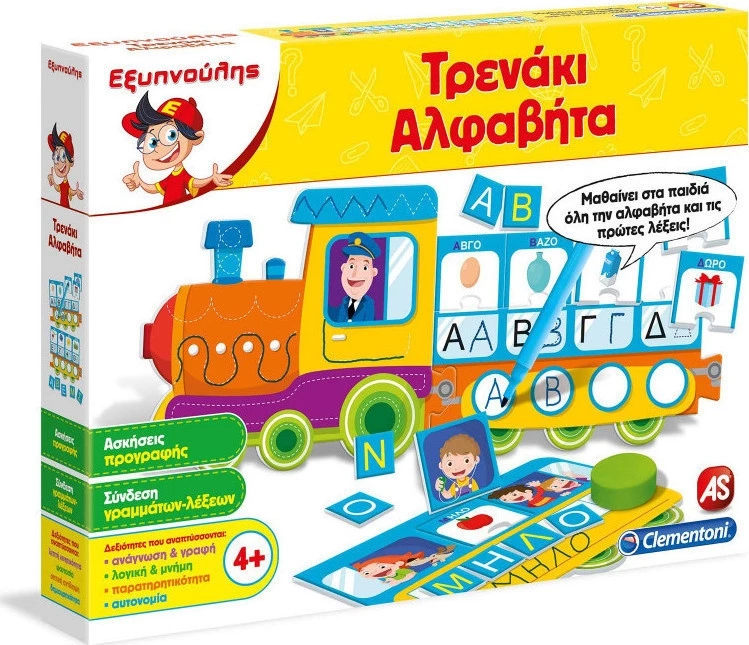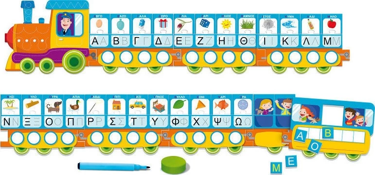 Το Τρενάκι μήκους 2 μέτρων, με τις πολύχρωμες κάρτες-παζλ, το σφουγγαράκι και το μαρκαδόρο που σβήνει, μαθαίνει στο παιδί να γράφει την Αλφαβήτα και τις πρώτες τους λέξεις!