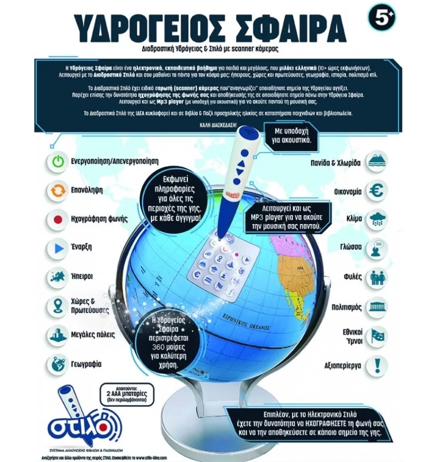 Επιτραπέζιο Διαδραστική Υδρόγειος Σφαίρα με Στυλό Η Υδρόγειος Σφαίρα είναι ένα ηλεκτρονικό, εκπαιδευτικό βοήθημα για παιδιά και μεγάλους, που μιλάει ελληνικά (10+ ώρες εκφωνήσεων). Λειτουργεί με το Διαδραστικό Στιλό και σου μαθαίνει τα πάντα για τον κόσμο μας: ήπειρους, χώρες και πρωτεύουσες, γεωγραφία, ιστορία, πολιτισμό κτλ. Το Διαδραστικό Στιλό έχει…