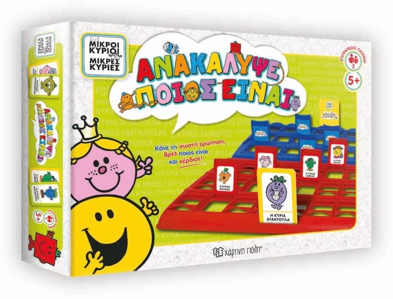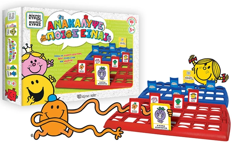 Επιτραπέζιο Μικροί Κύριοι-Ανακάλυψε Ποιός Είναι Κάνε την σωστή ερώτηση, βρες ποιός είναι και κέρδισε. Το κουτί περιλαμβάνει: 2 ταμπλό 48 μικρές κάρτες χαρακτήρων (24 μπλε και 24 κόκκινες) 24 μεγάλες κάρτες χαρακτήρων (μυστικές)