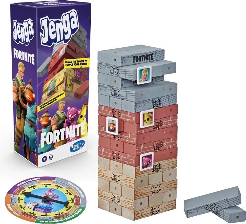 Το Jenga Fortnite είναι εμπνευσμένο από το δημοφιλές videogame! Χαρακτήρες του αυθεντικού Fortnite κατακλύζουν τον πύργο του Jenga ,με στόχο του κάθε παίκτη να είναι ο πρώτος που θα φτάσει στην κορυφή! Προσπάθησε να οδηγήσεις τον αγαπημένο σου ήρωα Fortnite στην κορυφή του πύργου πριν αυτός πέσει! Γύρνα τον τροχό για να δεις τι είδους τουβλάκια θα αφαιρέσεις και πόσα επίπεδα θα ανέβεις ενώ, ο αντίπαλός σου μπορεί να κατέβει..!