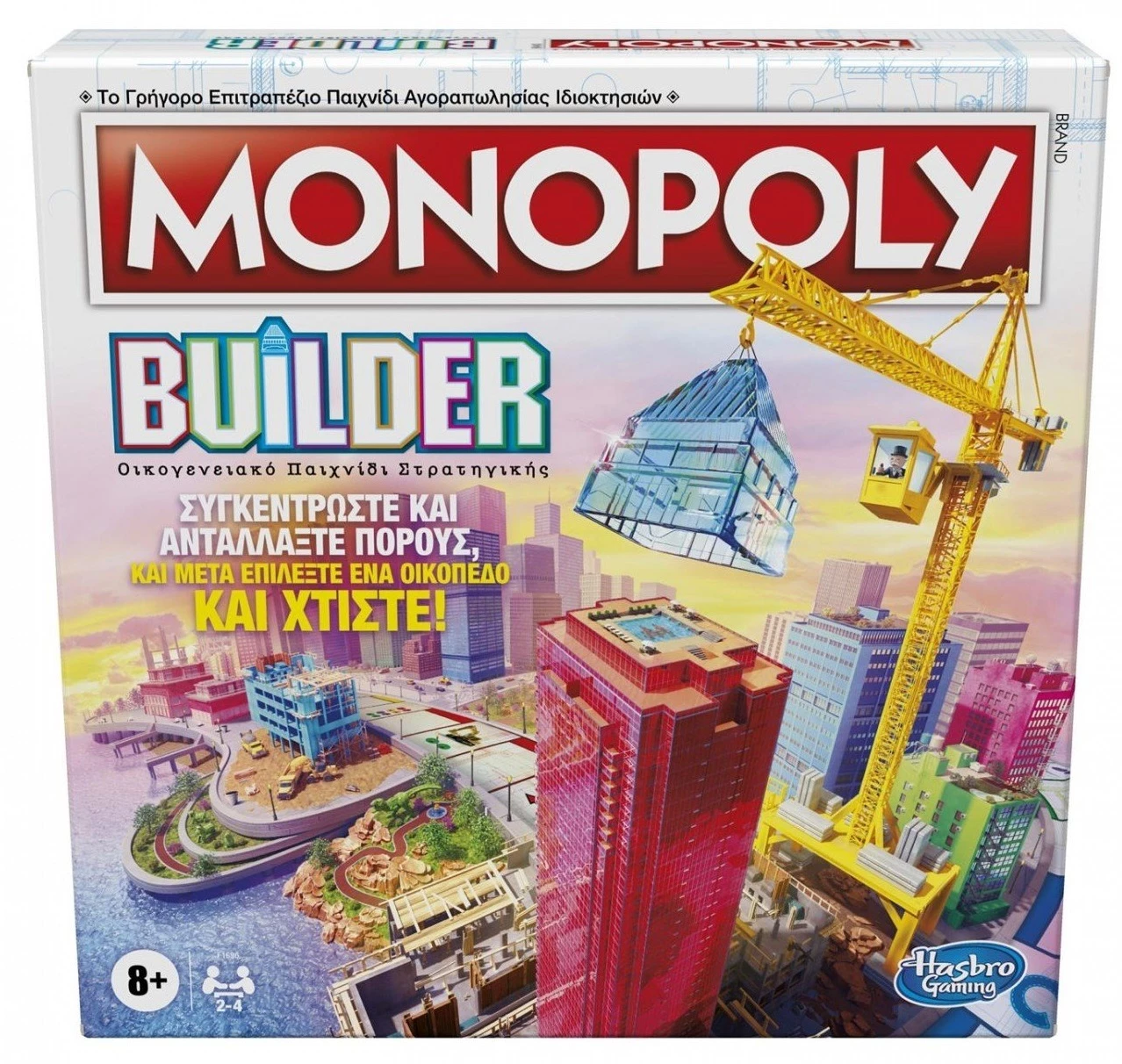 Το νέο Monopoly Builder εκτυλίσσεται στο Νησί Monopoly, που είναι τοποθετημένο στο κέντρο του ταμπλό. Με το παιχνίδι στρατηγικής Monopoly Builder, οι παίκτες μετακινούνται στο ταμπλό αγοράζοντας ιδιοκτησίες, εισπράττοντας ενοίκια και συγκεντρώνοντας πόρους. Επίσης, χρησιμοποιούν τουβλάκια για να χτίσουν τη δική τους πόλη πάνω στο νησί! Όσο περισσότερο χτίζει ένας παίκτης, τόσους περισσότερους πόντους κερδίζει. Το παιχνίδι τελειώνει όταν χτιστεί το ρετιρέ. Νικητής είναι ο παίκτης με τους περισσότερους πόντους! Αυτό το οικογενειακό επιτραπέζιο παιχνίδι είναι σχεδιασμένο για 2-4 παίκτες ηλικίας 8 ετών και άνω και προσφέρει άφθονη διασκέδαση.