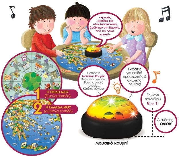•Η Ελλάδα μου: τα παιδιά θα ακούσουν από το buzzer απλές ερωτήσεις που αφορούν πόλεις, μνημεία, αξιοθέατα της Ελλάδας και θα πρέπει να μετακινηθούν στο αντίστοιχο σημείο του χάρτη-ταμπλό για να κερδίσουν τους πόντους τους. Νικητής είναι ο παίκτης με τους περισσότερους πόντους.
