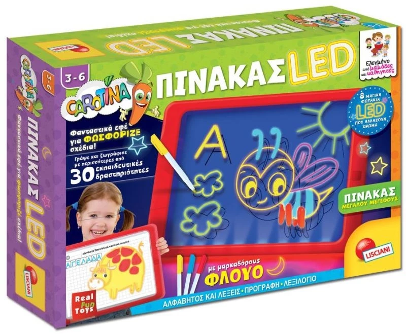 Διασκεδάστε φωτίζοντας σχέδια, γράμματα και λέξεις! Με τον πίνακα LED της Lisciani και τους φωσφοριζέ μαρκαδόρους, μπορείτε να διασκεδάσετε και να παίξετε με τη φαντασία σας! Επιπλέον, μαθαίνετε να διαβάζετε και να γράφετε με τις εκπαιδευτικές κάρτες προοδευτικής δυσκολίας.