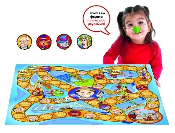 Περιλαμβάνει: βιβλιαράκι με παραμύθι, ταμπλό, 4 πιόνια-Πινόκιο, 8 κάρτες “ΝΑΙ”-“ΟΧΙ”, 28 μύτες, οδηγίες χρήσης.