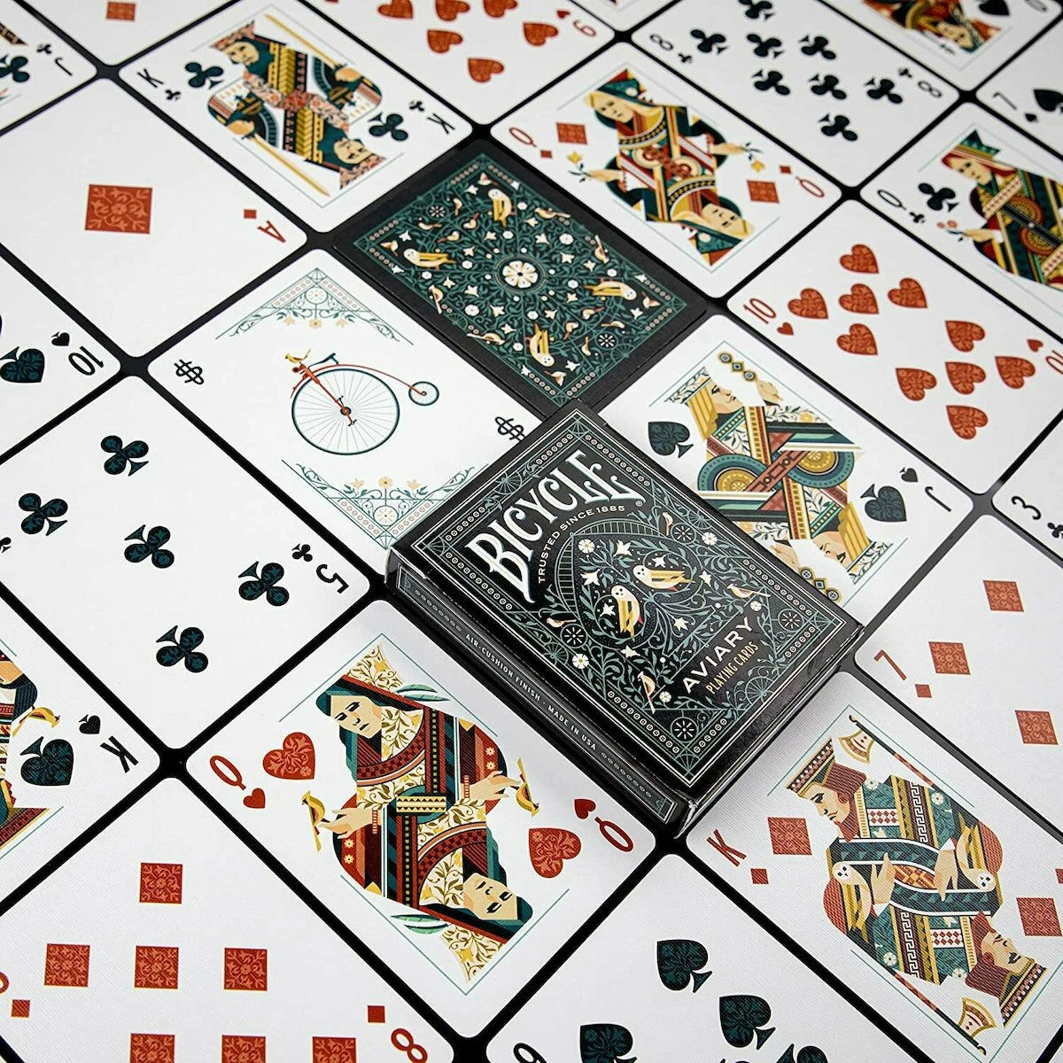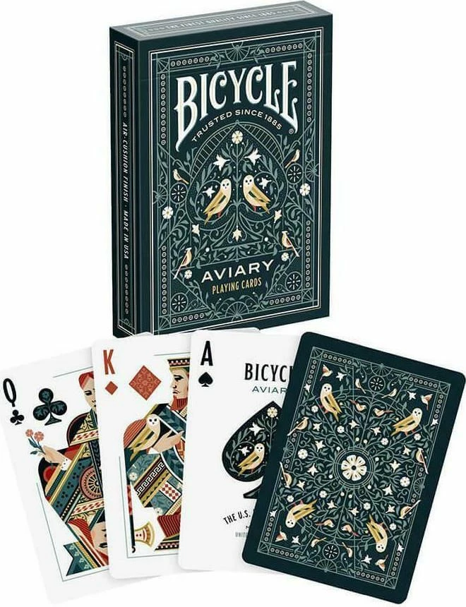 Αφήστε το επόμενο παιχνίδι καρτών σας να απογειωθεί με την τράπουλα Bicycle® Aviary! Με προσαρμοσμένα εικονογραφημένα πρόσωπα, χρώματα και πλάτες καρτών, το σχέδιο Bicycle Aviary είναι όμορφο, περίτεχνα σχεδιασμένο και θα γίνει μια τέλεια προσθήκη στη συλλογή σας.